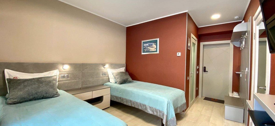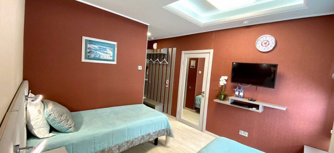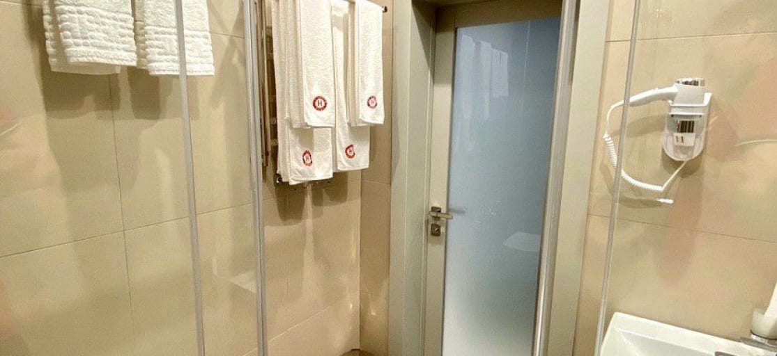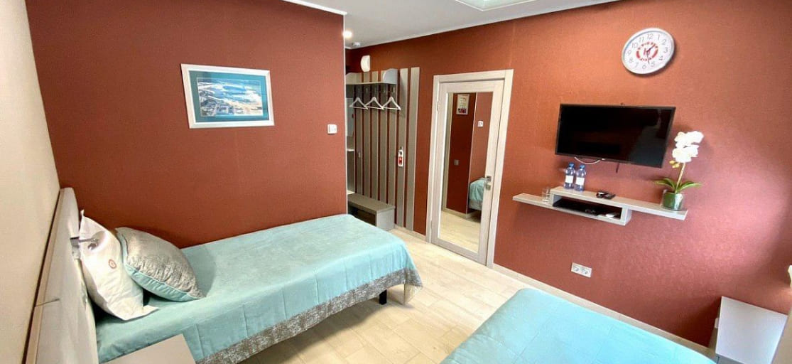 Уютный однокомнатный номер площадью 16 м² станет отличным местом для отдыха. В состав номера входят: 2 односпальные кровати. Санузел с душевой кабиной. Шкаф для одежды. Телевизор. Тумбочка. Чайник в баре. Зеркало и фен. В номере проводится регулярная смена белья и ежедневная уборка.
