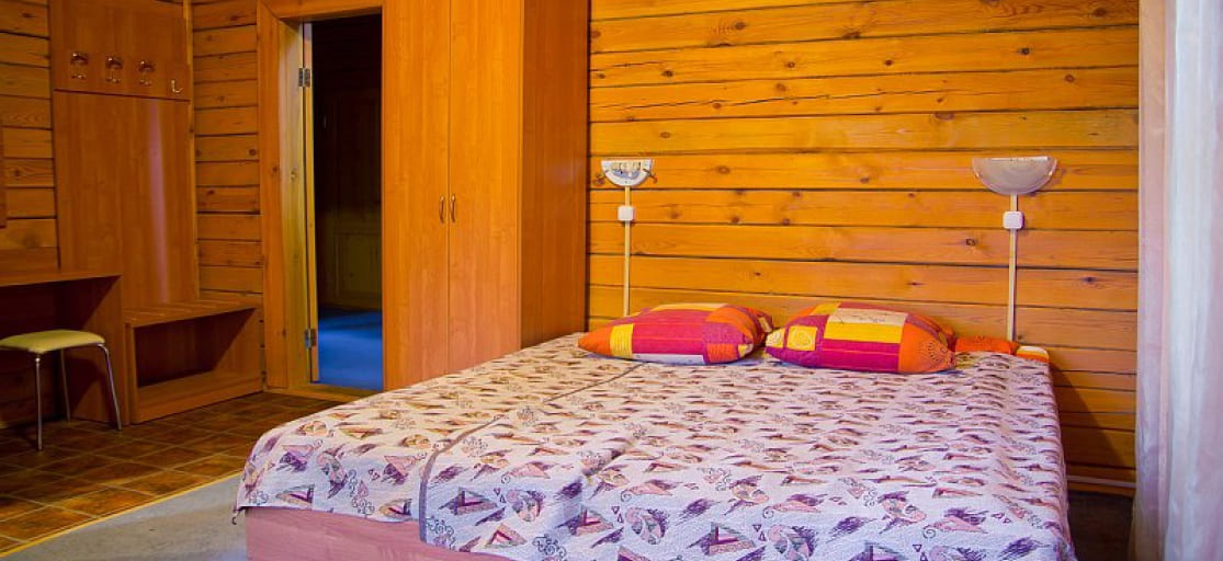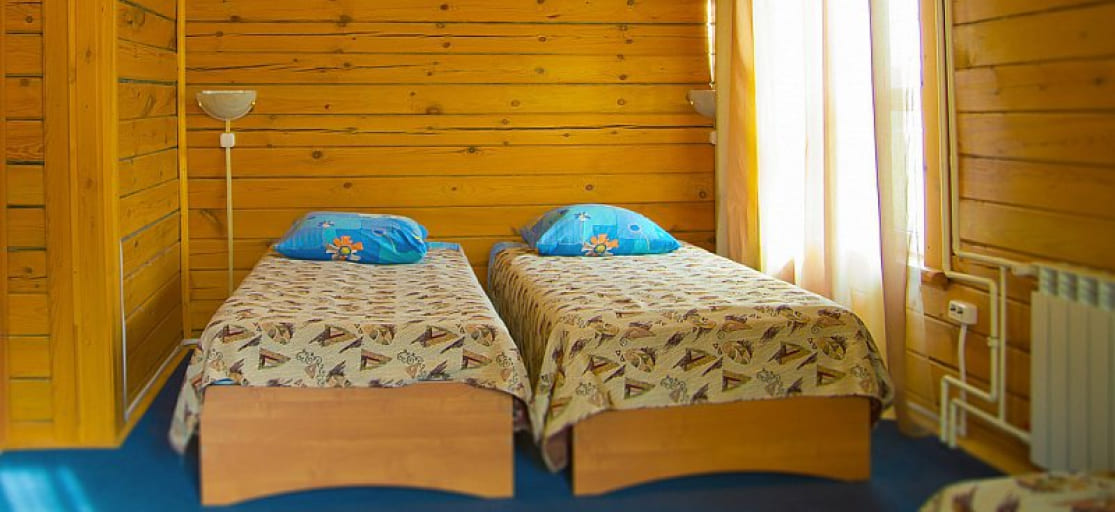 Однокомнатный номер: 3 односпальные кровати, тумба, шкаф, телевизор, чайник, фен, общий санузел с ванной на 2 номера. Площадь номера – 15 кв. м.